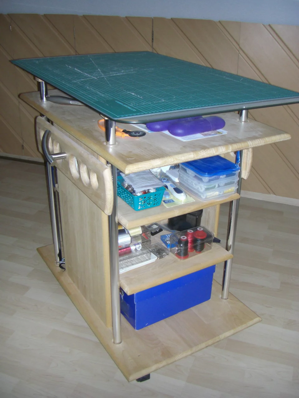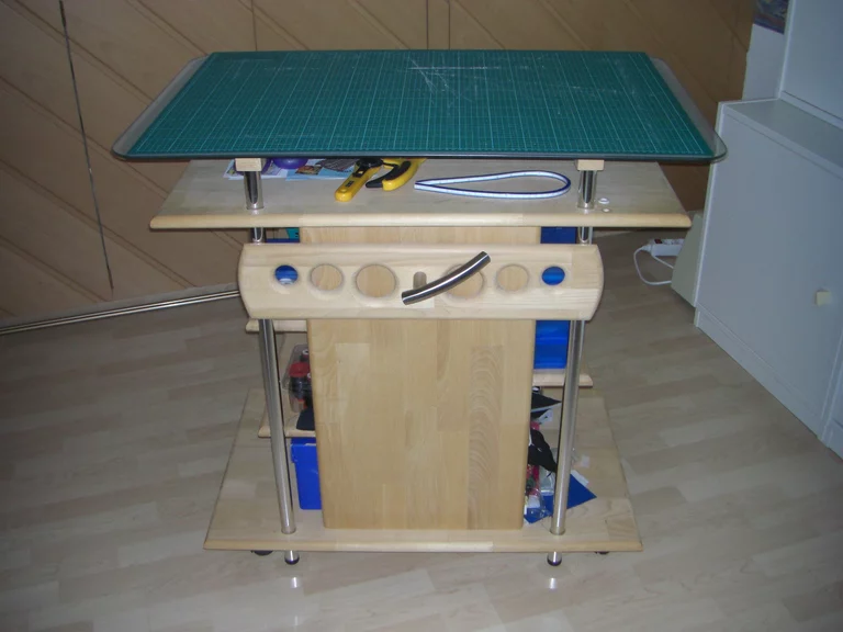 Die Maße sind der großen Schneidematte angepasst und er ist so hoch, dass ich mit geradem Rücken stehend ohne Bücken daran arbeiten kann.
