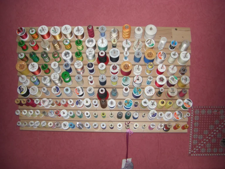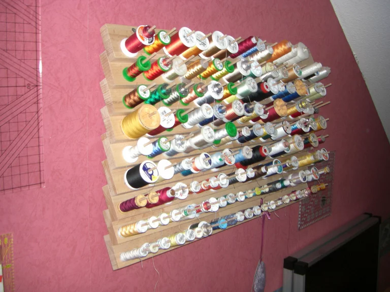 Um meine vielen Garne schön übersichtlich greifbar am Nähtisch zu haben, bauten Dieter und Pascal mir diesen Garnrollenhalter für die Wand.