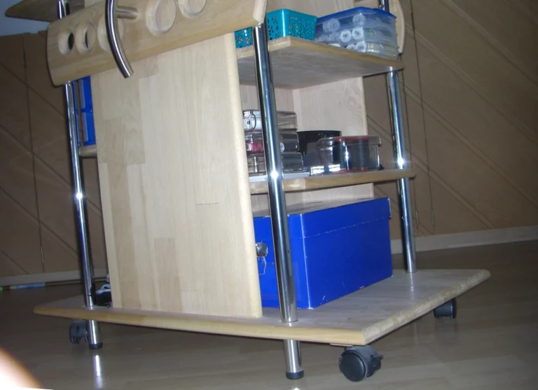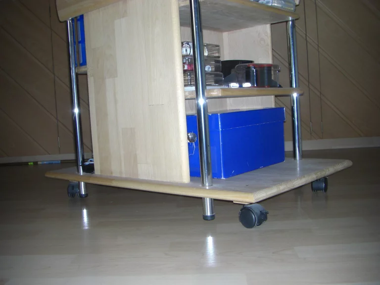 Er ist rollbar, kann durch das Drehen der "Türklinke" jedoch auch auf seine Tischbeine gestellt werden. Es stellte sich jedoch heraus, dass er in sich so schwer ist, dass er auch in der Rollposition nicht freiwillig wegrollt beim Arbeiten.