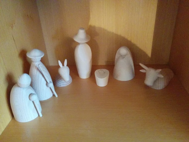 Dieter und ich bevorzugen generell und auch bei Krippendarstellungen die sehr vereinfachten, schlichten Formen. Schon 2018 begann Dieter, dieses Ensemble zu drechseln, leider ist es bis heute nicht fertig. Das stilisierte Jesuskind in der Krippe wird durch einen unserer alten Eheringe symbolisiert.