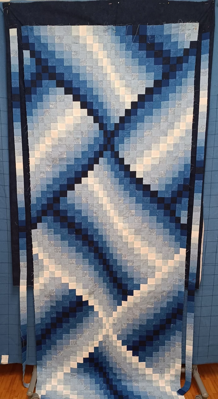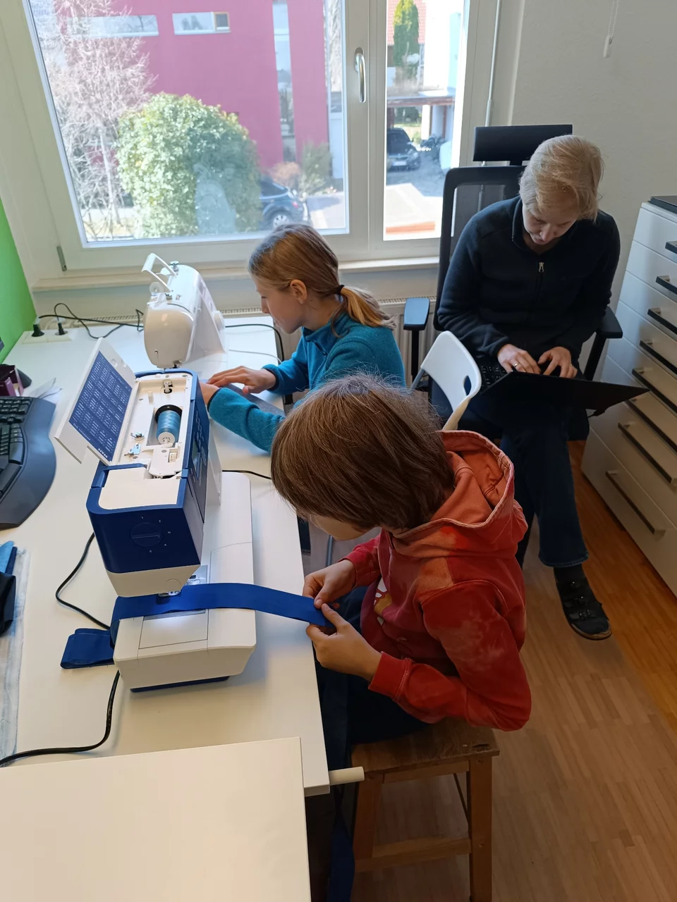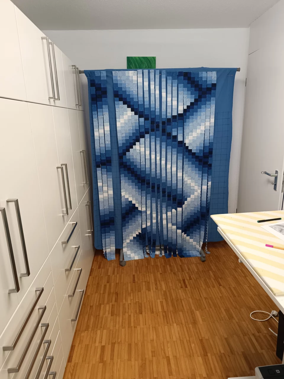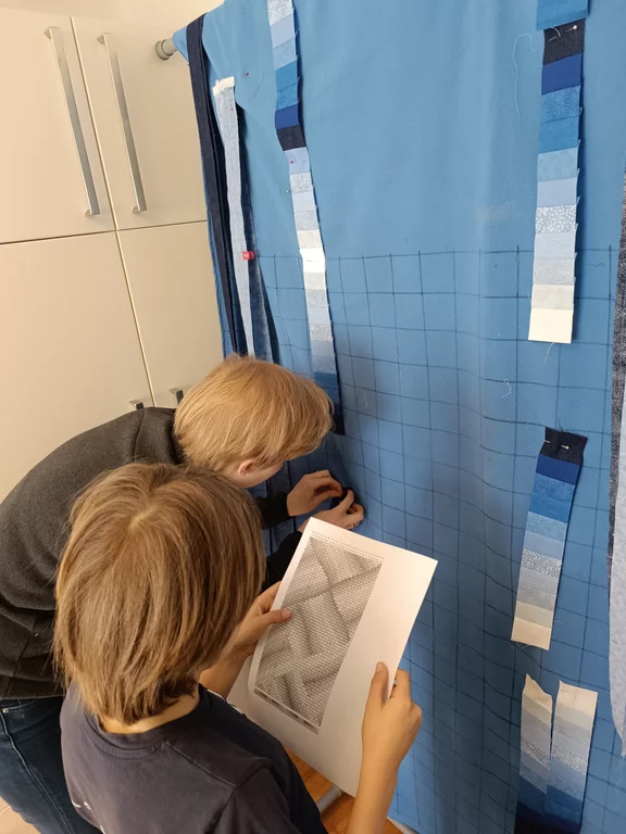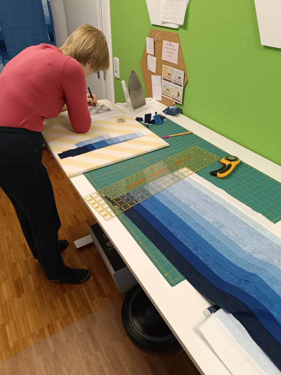 Nach akribischer Planung mit Exceltabellen wurden erst Streifen geschnitten und diese dann von den Kindern säuberlich zu einem gestreiften Grund-Quilt zusammengenäht. Anhand der Excel-Ausdrucke konnten dann an der Designwand nach und nach die einzelnen Komponenten an die richtige Stelle gepinnt und dann wiederum von den Kindern zusammengenäht werden. Erst bei den ganz großen Flächen durfte ich dann selbst wieder an die Nähmaschine und das Maschinenquilten blieb auch mir überlassen.